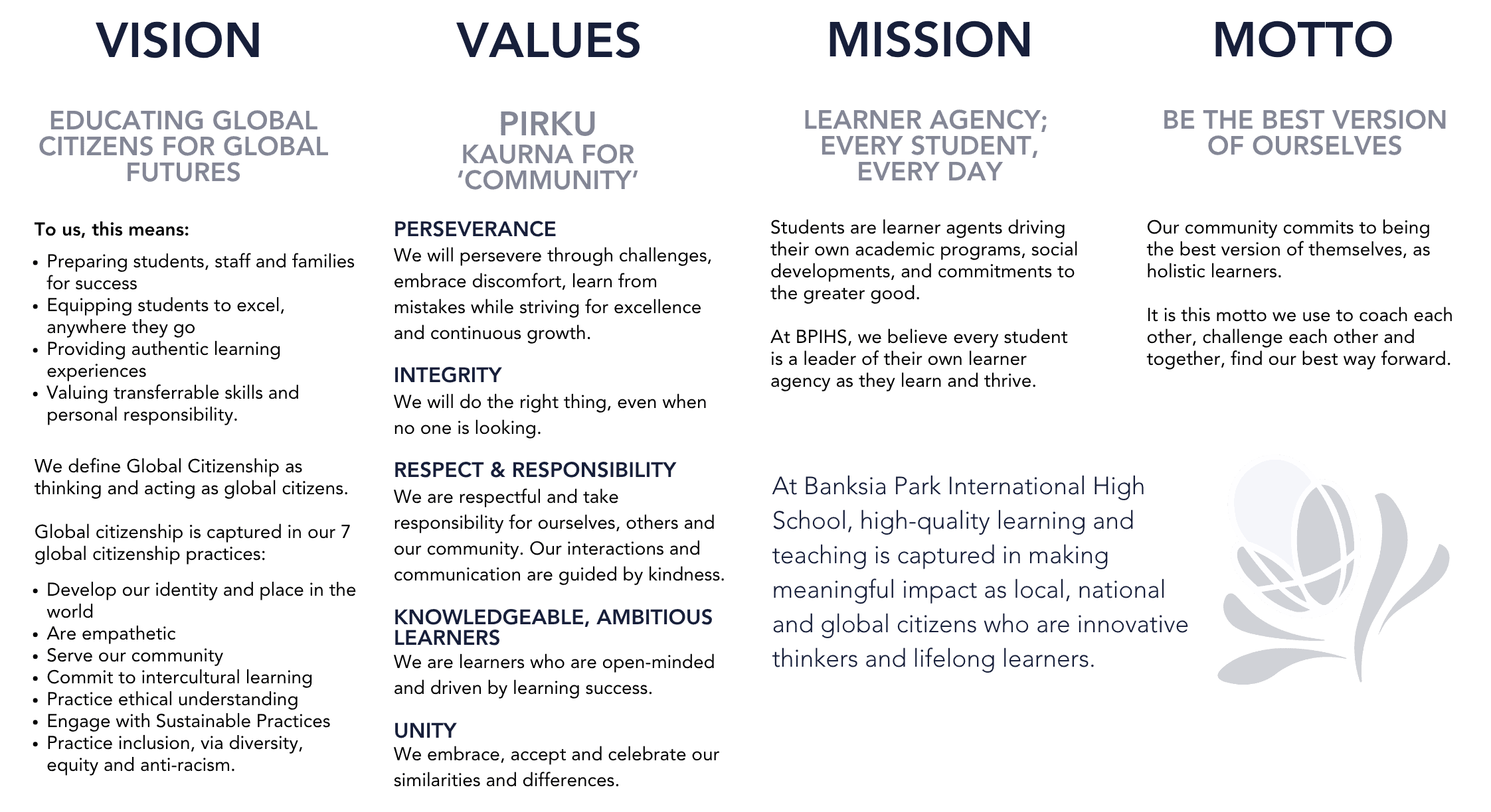 Young people are at the heart of everything we do at Banksia Park International High School. We acknowledge and celebrate the diversity of our school population, value and respect individuals and actively support students to learn, flourish and realise their aspirations. We pride ourselves in offering a comprehensive academic, vocational and extension curriculum. We focus on world-class learning, international awareness, and standards of excellence, and are committed to ensuring local and international students share the benefits of our internationally recognised and accredited school. We foster a passion for learning and improvement, underpinned by a foundation of skills in literacy, numeracy, information technology, leading to high educational outcomes